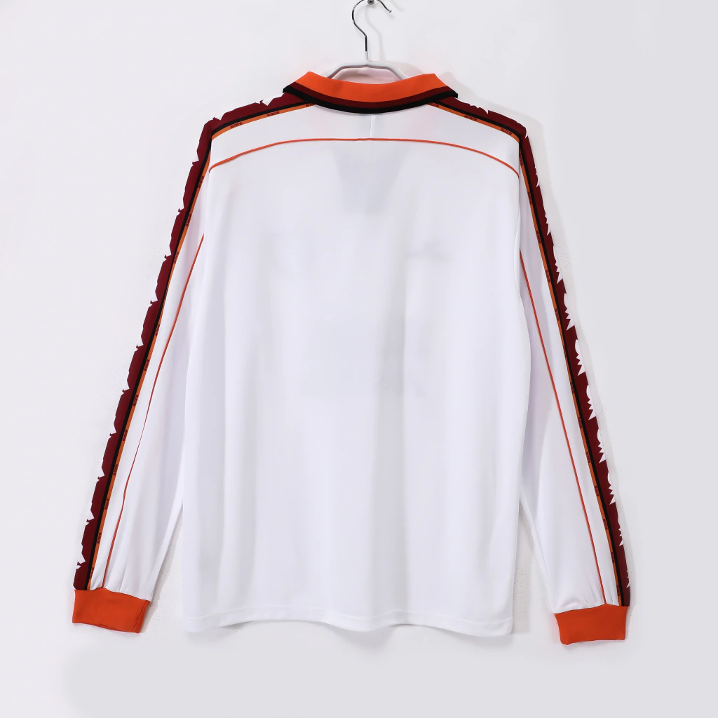 Uma verdadeira joia para os apaixonados pelo futebol italiano! Essa camisa da AS Roma, usada na temporada 1997/98, é pura nostalgia e estilo. Com seu tradicional tom bordô, detalhes em laranja vibrante nas mangas longas e o icônico padrão da loba capitolina, ela representa uma era clássica da Serie A.