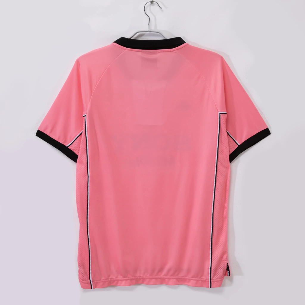 Uma verdadeira joia para os fãs da Velha Senhora e amantes das camisas clássicas! Esse modelo alternativo da Juventus, com seu visual marcante em rosa e preto, é um dos mais ousados e colecionáveis da história do clube. Patrocinada pela Sony MiniDisc e fabricada pela lendária Kappa, essa peça é sinônimo de estilo e história dos anos 90.