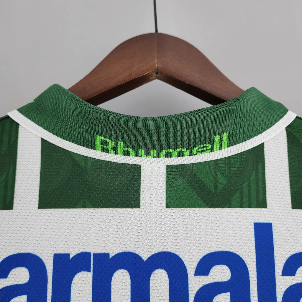 Produzida pela Rhumell em 1996, essa camisa listrada em verde e branco é um dos mantos mais lembrados da era Parmalat. Com o patrocínio clássico da Parmalat em azul, foi usada por craques como Rivaldo, Djalminha, Cafu e Luizão, em uma temporada de ataque avassalador que encantou o futebol brasileiro, marcando mais de 100 gols no Campeonato Paulista. Um manto que simboliza o talento e a ousadia do Verdão nos anos 90.